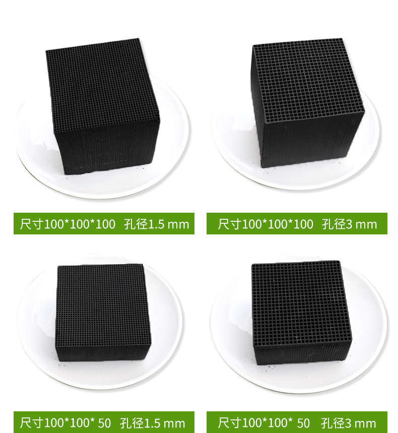 5、通常的蜂窩結(jié)構(gòu)活性炭主要有圓柱形、橢圓柱形和長(zhǎng)方體三種外形,它們含有正方形、圓形、六邊形和三角形的通道,具有較大的比表面積和豐富的微孔結(jié)構(gòu)。