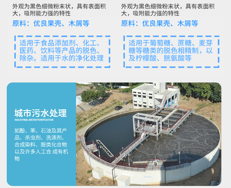 以磷酸法生產的木質粉狀活性炭,具有發達的中孔結構和發達的比表面積,吸附容量大、過濾速度快,不含鋅鹽之特性。廣泛適用于食品工業的糖類、谷氨酸及鹽,乳酸及鹽、檸檬酸及鹽,葡萄酒,調味品,動植物蛋白、生化制品、醫藥中間體、維生素等產品的脫色、精制、除臭、去雜。