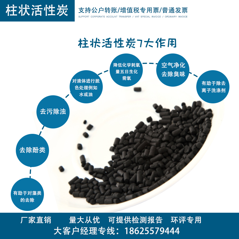 3. 柱狀活性炭的標準堆積密度在0.38-0.45g/cm3,一立方的柱狀活性炭重量應該在380-450公斤之內。
