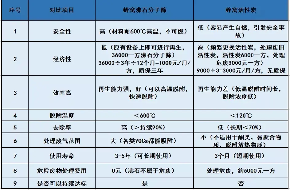 目前,活性炭是最常用的VOCs吸附劑,但存在再生困難、抗濕性差、易燃等諸多問題。與活性炭等常規吸附劑相比,沸石分子篩作為VOCs吸附劑其主要優勢在于:
