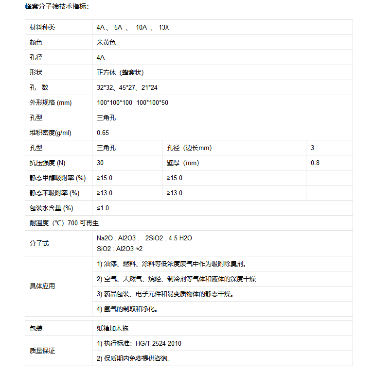 蜂窩狀沸石分子篩外形為100×100×100(mm)的正方蜂窩體,同時根據使用工況可定制規格。蜂窩沸石分子篩適用于二甲苯、酯類吸附,適合噴涂等行業,應用于固定吸附床上,作為催化燃燒(RCO)和蓄熱燃燒(RTO)的廢氣濃縮載體,可替代目前的蜂窩狀活性炭,其脫附溫度可在180-220℃,脫附干凈,吸附能力不衰減,使用壽命長。耐高溫,在500℃以下不會發生坍塌、變形,具有活性炭不可比擬的安全性和運營費用低廉性。