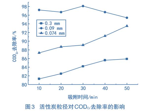 采用10g顆粒狀活性炭,粒徑分別為0.3mm、0.09mm、0.074mm的在常溫條件下吸附,測定不同吸附時(shí)間的CODcr去除率,結(jié)果如圖3所示。