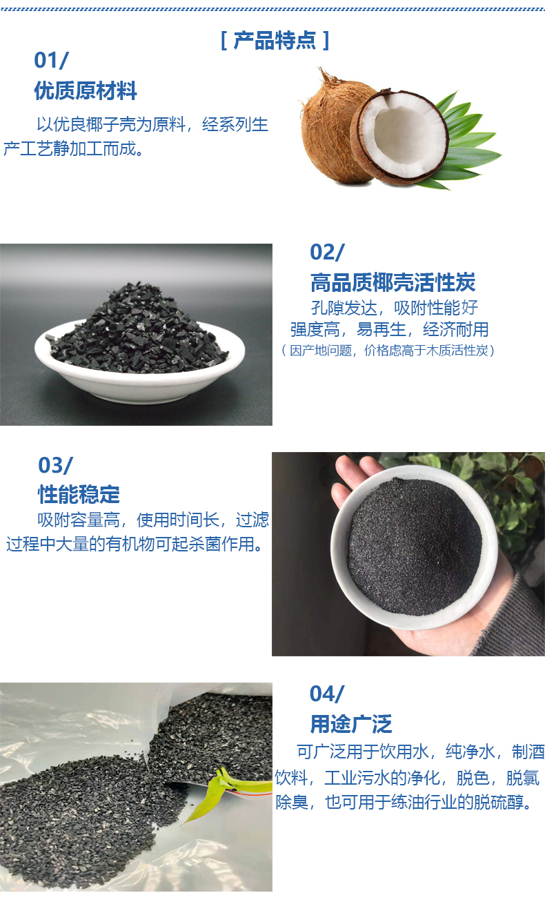 5: 飲用水用椰殼活性炭:活性炭用于家庭直接飲用水、自來水廠水處理、桶裝水生產的深度水凈化。
