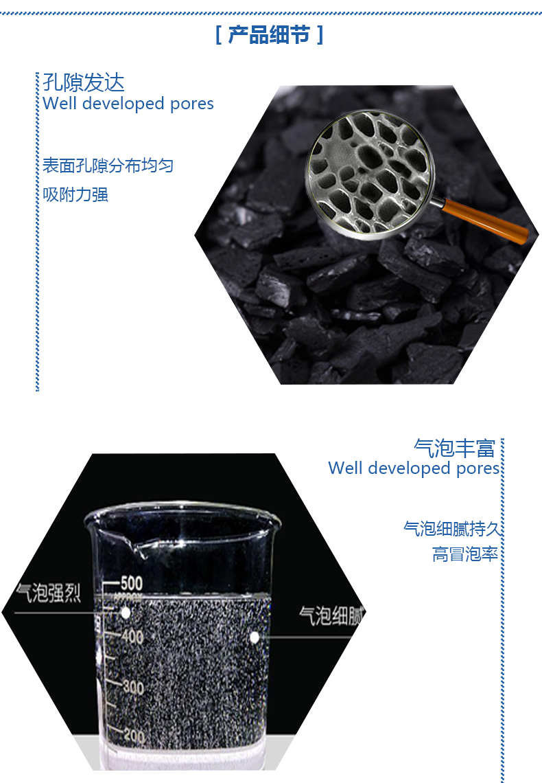 4、椰殼活性炭為小分子孔隙結構,將活性炭放到水里,其吸附水分子時所排空氣會產生許多非常細小的水泡(肉眼剛好能看見),密密麻麻的不停浮向水面。而煤質活性炭一般為大分子孔隙結構,所產生的氣泡相也對較大。
